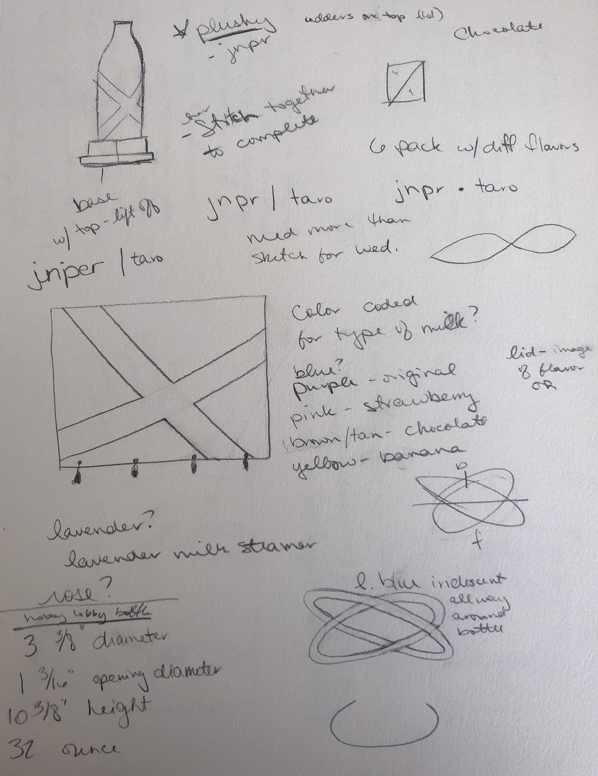 We were given partners and tasked with creating a drink based on their interests. My partner, Jenna Nowak, and I sat down together for a while and discussed our interests, and I started to see a theme. The first decision was on what drink to make. The original brief was to create a package for an alcoholic drink, but Jenna did not like alcohol. Instead, I created branding for a milk company to fit her preferences.
